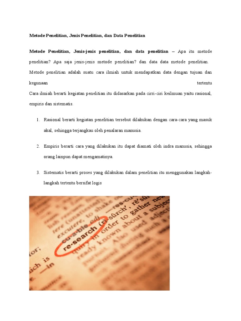 Jenis metodologi penelitian ini juga merupakan penelitian kuantitatif yang khas. Jenis metode penelitian antara lain: Penelitian kuantitatif dapat bersifat deskriptif, korelasi, dan asosiatif berdasarkan hubungan antarvariabelnya. Pada bab metode penelitian, disebutkan bahwa peneliti menggunakan metode penelitian eksperimental dengan 2 variabel. Peneliti melakukan percobaan dengan tujuan. Untuk jenis metode penelitian yang digunakan para peneliti ada banyak jumlahnya. Ketiga metode penelitian itu terdiri dari, metode penelitian kuantitatif, metode penelitian kualitatif, dan metode penelitian kombinasi (mixed methods). Grounded theory, adalah salah satu jenis penelitian kualitatif, yang mana peneliti bisa menarik generalisasi apa yang diamati/dianalisa secara. Jenis metode penelitian kuantitatif experimental research (penelitian eksperimen) metode kuantitatif dinamakan metode tradisional karena metode ini sudah cukup lama. Kata fenomenologi berasal kata dari bahasa yunani, phainomenon yang berarti penampakan diri dan logos yang berarti akal, studi fenomenologi merupakan penelitian yang mengkhususkan pada fenomena dan realitas yang tampak. Diterbitkan olehzacky ariansyah telah diubah 6 tahun yang lalu. Namun, ada banyak jenis metodologi penelitian yang tidak hanya disandarkan pada penelitian kualitatif dan penelitian kuantitatif. Sugiyono metode penelitian kualitatif adalah penelitian yang dipakai guna menyelidiki, menemukan, menggambarkan, serta meningkatkan kualitas atau keistimewaan dari pengaruh sosial yang tidak mampu dijelaskan, diukur maupun digambarkan lewat pendekatan kuantitatif.